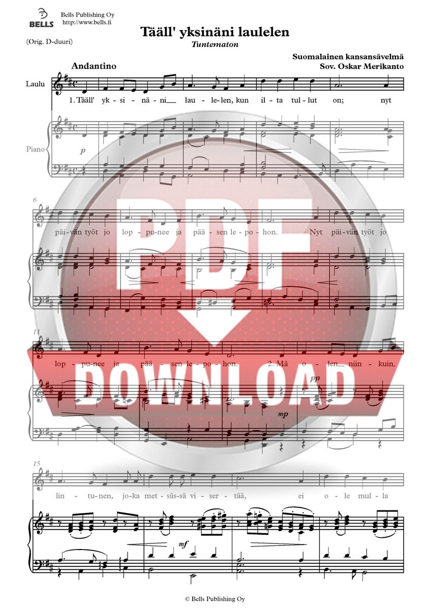 Suomalainen kansanlaulu (sov. Oskar Merikanto): Tääll' yksinäni laulelen (san. tuntematon)