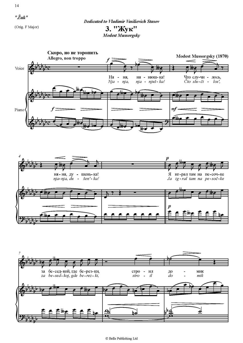 Kokoelma sisältää Modest Musorgskin (1839-1881) laulusarjan Детская ('Detskaja', suom.Lastenkamari) lauluäänelle ja pianolle. Edition (for high voice) sävellajit sopivat parhaiten tenori- ja sopraanoäänelle. Nikolai Rimski-Korsakovin laatima editio.