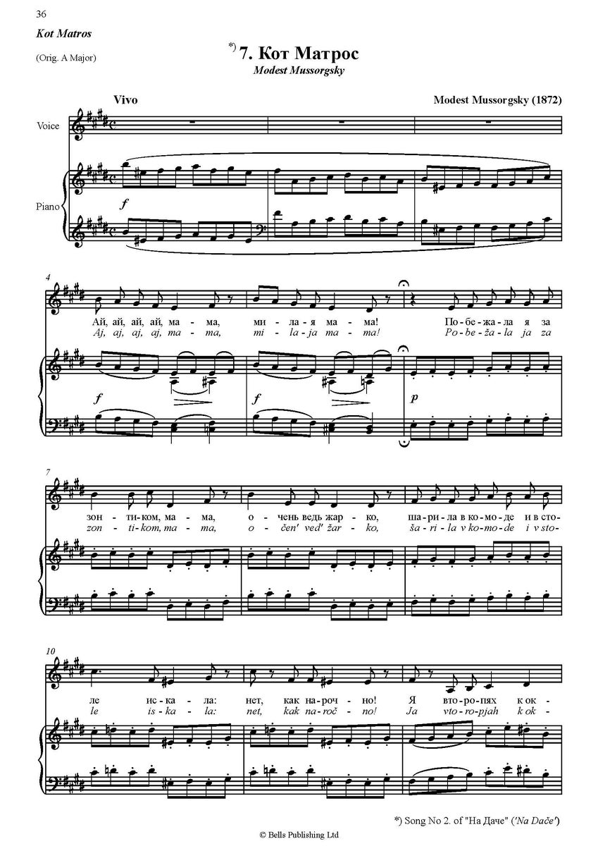 Kokoelma sisältää Modest Musorgskin (1839-1881) laulusarjan Детская ('Detskaja', suom.Lastenkamari) lauluäänelle ja pianolle. Edition (for very low voice) sävellajit sopivat parhaiten syvälle bassoäänelle. Nikolai Rimski-Korsakovin laatima editio.